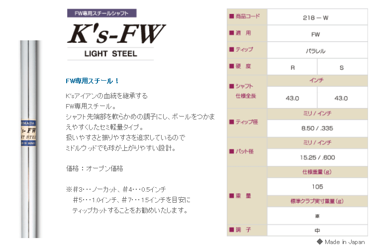 【エントリーで全品ポイント3倍】【DS-ADAPT対応】【コブラ ウッド用 互換 スリーブ付きシャフト】【ドライバー用対応】 島田ゴルフ製作所 Ks FW スチール (Shimada Ks-FW)