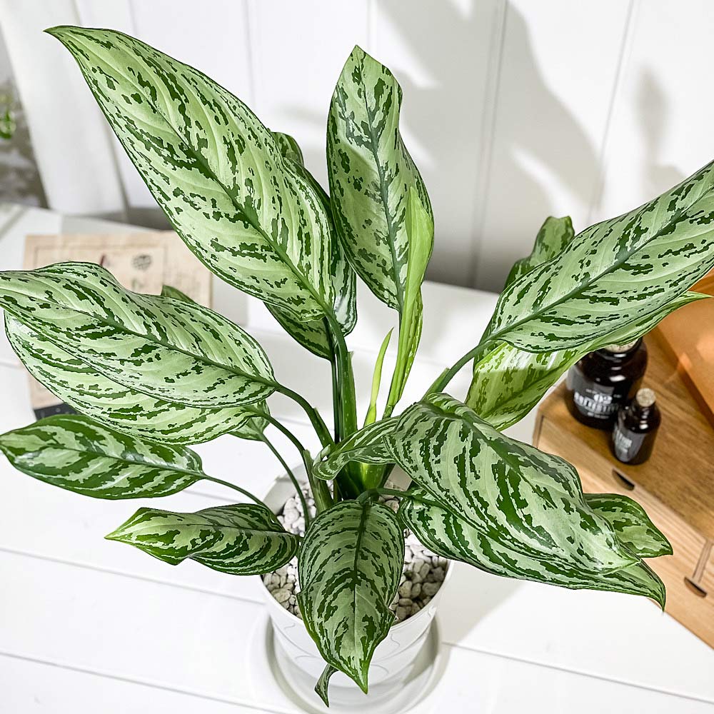 PLANCHU 観葉植物 アグラオネマ シルバークイーン 6号鉢 受け皿付き 育て方説明書付き Aglaonema ‘Silver Queen’ 幸せを招くタイの宝石 アロイド